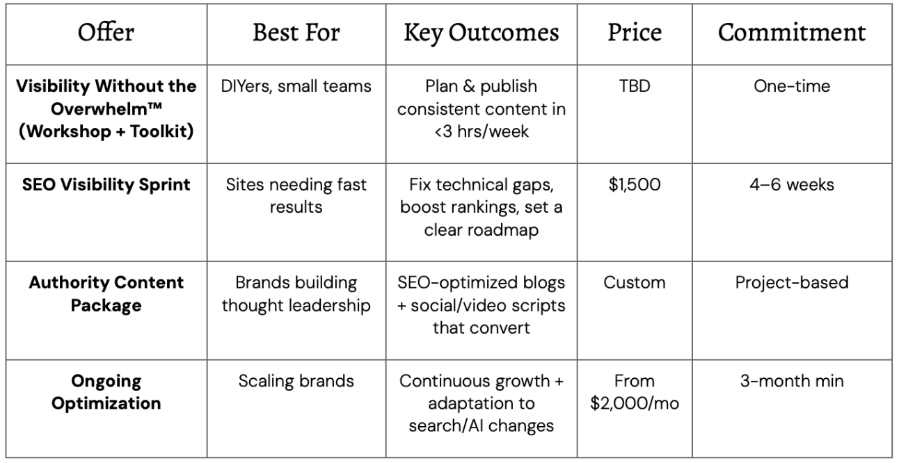 Whether you’re rebuilding your site, launching a new offer, or tired of guessing what Google wants—let’s talk. We’ll cut through the noise and map out what actually matters for your business goals.